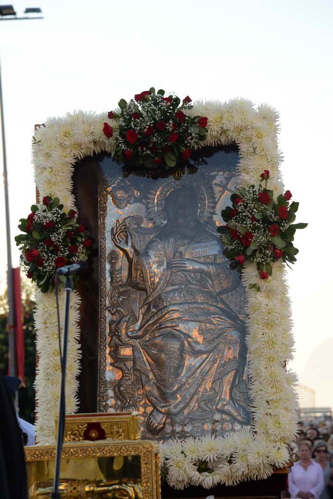 συνεχείᾳ ἡ ἁγία Κάρα καί ἡ Ἱερά Εἰκόνα, ἐλιτανεύθησαν διά θαλάσσης, μέχρι τόν μῶλο