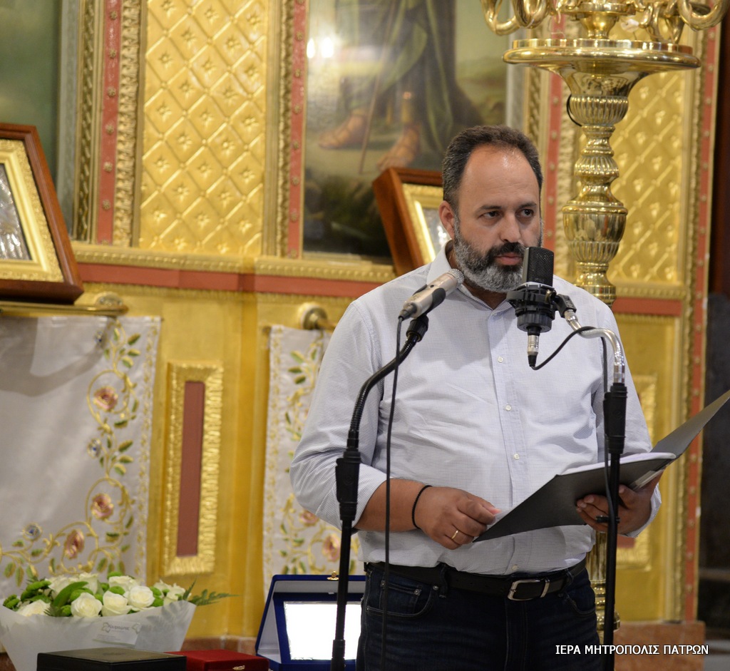 Ὁ Σεβασμιώτατος ὡμίλησε μέ λόγια συγκινητικά γιά τήν προσφορά τοῦ σεβασμίου Ἱερέως, ἀναφερθείς στήν πολυετῆ καί καλλίκαρπον, ἐν ταπεινώσει καί βαθυτάτῃ συνειδήσει εὐθύνης, διακονίαν του εἰς τήν Ἀποστολικήν Μητρόπολιν τῶν Πατρῶν, ἐκφράσας τίς εὐγνώμονες εὐχαριστίες πρός τόν σεμνόν, ἱεροπρεπῆ καί εὐπροσήγορον Ἱερέα, ὁ ὁποῖος μετά τῆς μακαριστῆς πρεσβυτέρας του Ἰωάννας ἀπέκτησαν 11 τέκνα.